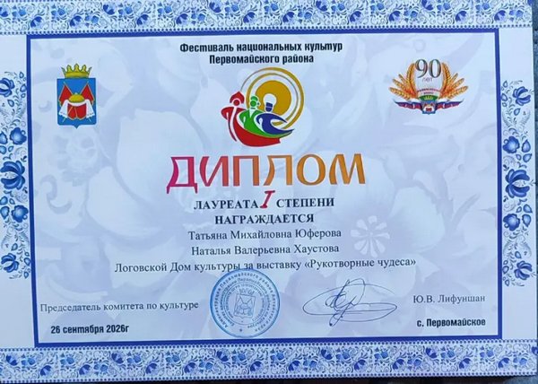 26 сентября 2025 года Логовская библиотека приняла участие в районном фестивале национальных культур Первомайского района с выставкой декоративно-прикладного творчества «Волшебный лоскуток». Библиотекарь представила свои творческие работы и работы читателей, а так же книжную выставку «Лоскутные идеи». Юферова Татьяна Михайловна поделилась секретами изготовления, рассказывала о простых способах и приёмах изготовления, отвечала на интересующие вопросы. Экспозиция привлекала внимание разнообразием видов и техник лоскутного шитья. Чего здесь только не было: салфетки, прихватки, коврики, подставки и многое другое. Красота, фантазия, талант и мастерство — все эти слова относятся к участникам экспозиции. Их работы подарили жителям и гостям села яркие эмоции, радость встречи с рукотворной красотой. Все участники декоративно-прикладной выставки получили диплом лауреата 1 степени от организаторов.